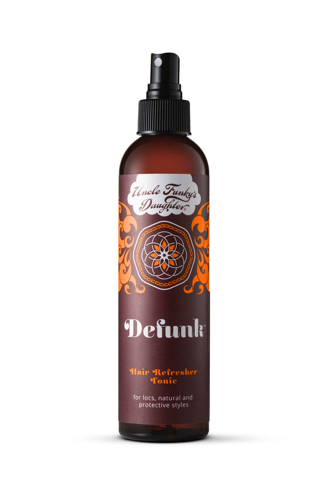 Defunk Hair Refresher Tonic has come to rescue you from your sweaty exercise, greasy spoon and smoky juke joint blues. This herbal hair and scalp cleanser is loaded with plant extracts that neutralizes odors, soothes itchy scalp and stimulates hair growth. A great refresher for all hair types. Effective for removing odor and buildup in starter and mature locs. 8 oz