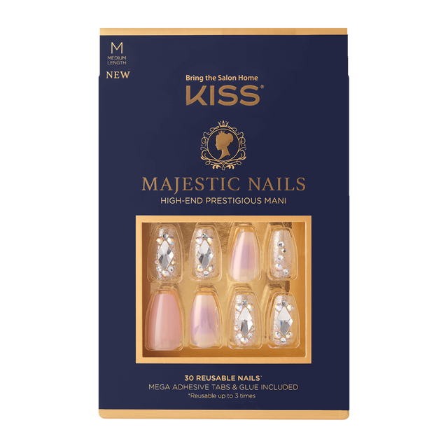 KISS Majestic Nails – Treat yourself like royalty with these NEW high-end prestigious gel nails. These salon quality nails are rewearable , and you can wear them up to 3X! The style My Crown features a long coffin shape, nude and gold glitter nails and stunning jewel accents. These versatile nails are multi-use by applying with included adhesive tabs the 1st two times, then glue on for your final wear. Packaging is eco conscious and printed with soy ink.
