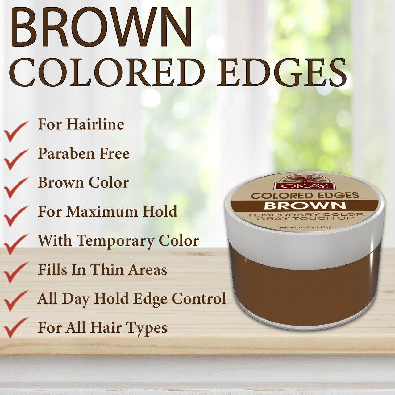 Colored Edges is great for touching upgray areasin between treatments and works great for edge control. Use this product toinstantly conceal gray regrowth areas and to tame unruly edges. It can easily be applied to eyebrows, hairlines, sideburns, new hair growth, beards, mustaches and more. This is a wash out hair color solution available in 3 colors.