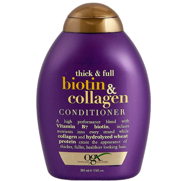 OGX Thick & Full Biotin & Collagen Conditioner A high performance blend with Vitamin B7 Biotin, infuses nutrients into every strand while collagen and hydrolyzed wheat protein create the appearance of thicker, fuller, healthier looking hair.